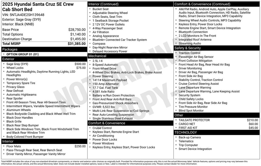 HADDAD HYUNDAI 689 EAST STREET PITTSFIELD, MA 01201 413-997-2277 The selling price of the vehicle is market price plus the dealer documentation fee of $599, and the title fee of $5.00 that dealers may charge to procure the certificate of title. This vehicle may have an open recall. The dealer will make all reasonable attempts to clear this recall. If parts or non-remedy repairs are not available there may be a continued claim to monitor. Option Group 01, Hyundai Certified Used Vehicles Certified, 18" x 7.5J Alloy Wheels, 4-Wheel Disc Brakes, 4.081 Axle Ratio, 6 Speakers, ABS brakes, Air Conditioning, All Season Fitted Liners, Alloy wheels, AM/FM radio: SiriusXM, Apple CarPlay & Android Auto, Auto High-beam Headlights, Auto-leveling suspension, Brake assist, Bumpers: body-color, Cargo Net, Compass, Delay-off headlights, Driver door bin, Driver vanity mirror, Dual front impact airbags, Dual front side impact airbags, Electronic Stability Control, Emergency communication system: Bluelink+, Exterior Parking Camera Rear, First Aid Kit, Four wheel independent suspension, Front anti-roll bar, Front Bucket Seats, Front Center Armrest, Front reading lights, Fully automatic headlights, Illuminated entry, Low tire pressure warning, Occupant sensing airbag, Outside temperature display, Overhead airbag, Overhead console, Panic alarm, Passenger door bin, Passenger vanity mirror, Power door mirrors, Power steering, Power windows, Radio data system, Radio: AM/FM/HD Audio System, Rear anti-roll bar, Rear seat center armrest, Rear side impact airbag, Rear step bumper, Rear window defroster, Remote keyless entry, Security system, Speed control, Speed-sensing steering, Split folding rear seat, Spoiler, Stain & Odor Resistant Cloth Seat Trim, Steering wheel mounted audio controls, Tachometer, Tailgate Protector, Telescoping steering wheel, Tilt steering wheel, Traction control, Trip computer, Variably intermittent wipers, and Wheel Locks.