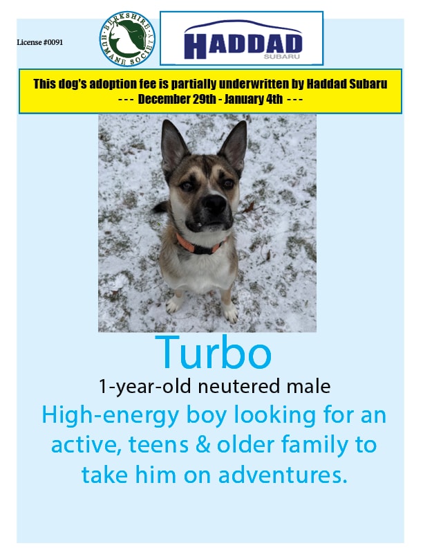 He's working on his house training and making great progress, so with continued training, he should pick it up in no time with a routine in place. Turbo would prefer a home with teens and older. If you think Turbo may be for the dog for you, please reach out to kennel staff at Berkshire Humane Society to learn more about him and how to potentially adopt him. (413)-447-7878 ext. 126